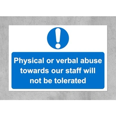 Physical or verbal abuse towards our staff will not be tolerated Safety sign Self adhesive sticker Digitally printed and laminated for extra durability Remove backing film and apply to dry, smooth, oil free surface.