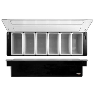 PIAZZA Condiment holder 6Ps table item USE - Accessory for the bar. DIMENSIONS - With 6 containers. 49 x 15 x 9 cm. With removable compartments, this condiment holder is the perfect solution for separating your toppings in a neat and concise order. Make sure your toppings stay fresh thanks to the transparent lid that allows you to view the contents.