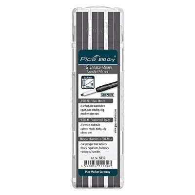 General description Pica BIG Dry refill leads are designed for versatility and convenience. These automatic pencil leads come in a sturdy plastic box, ensuring secure storage and easy access. The rectangular leads have a profile of 2 x 5 mm and a length of 150 mm, making them suitable for various applications. Technical specifications Lead profile: 2 x 5 mm Lead length: 150 mm Lead type: Graphite 2B Quantity: 12 refill leads per box Usage Compatible with most materials: dry or wet, glossy or rough, dusty or oily. Wipe clean from glossy surfaces with a damp cloth. Invisible when painted over with dispersion paint.