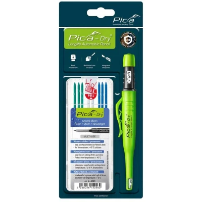 General description The Pica DRY Automatic Pencil 4040 is a professional marking tool designed for craftsmen, featuring effective dust and moisture protection. Its innovative design includes a push-button umbrella cap and a sealing ring for maximum protection against external influences. The pencil is equipped with a unique "Power Lock" mechanism that significantly enhances lead holding power, tripling its duration. The "LONGLIFE CAP" with a strong clip and integrated sharpener ensures long-term usability, making it an extremely sustainable choice thanks to its refillable nature. Technical specifications Lead diameter: 2.8 mm Lead length: 125 mm Set includes: 8 assorted leads (3 blue, 2 white, 3 green) Water jet resistant and permanent leads Chloride-free Protect from temperatures above 40°C Compatibility and accessories Compatible with Pica-Dry Special Refills 4040 Refills can be easily topped up from the back end Usage Marks on almost any surface: dry, wet, glossy, rough, or dusty
