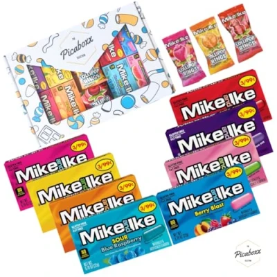 Picaboxx - Mike & Ike Gift Box. This Picaboxx includes a fun and tasty assortment of Mike & Ike candies, featuring: Eight Small Boxes Each Weighs 22g: Perfect for sharing or enjoying during movie nights, each box is filled with deliciously chewy Mike & Ike candies in assorted flavors. A sweet candy gift box is more than just a collection of sweets. Suitable for all special occasions. Contents May Vary Dependent on Availablity.