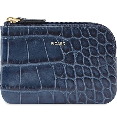 This key case for women from the Picard brand and from the Weimar 1 series is made of calf leather with elegant crocodile embossing and available in blue The key case closes and opens with a zip compartment and is rounded off with a stylish shape Inside the key case there are two chrome-plated key rings which are attached to leather straps The Picard brand key case has gold metal and logo details. The case has an elegant iridescent lining The key case from Picard from the Weimar 1 series has the following dimensions: 12 x 8 x 1 cm
