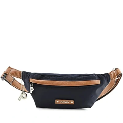 The belt bag from Picard is made from shimmering fine nylon and available in blue The belt bag has an adjustable leather-look strap with a buckle The men's bag has a main opening and another compartment on the front. Both are closed with a zip The belt bag from the Sonja series has leather-look appliqués and shines with silver-coloured metal details The Picard belt bag in blue has the following dimensions: 26 x 12 x 4 cm