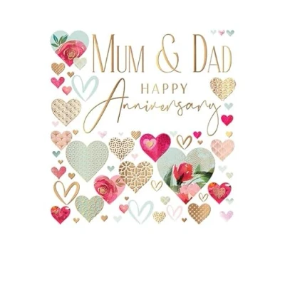 A High Quality Greeting Card and Envelope From Piccadilly Greetings Designed and made in the UK - supporting British jobs Caption: Anniversary Mum & Dad Description: Hearts Approximate size: 8 x 6