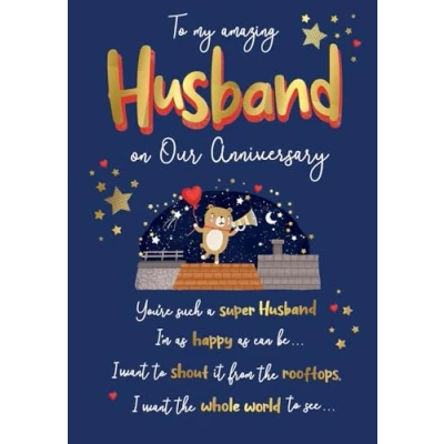 A High Quality Greeting Card and Envelope From Piccadilly Greetings Designed and made in the UK - supporting British jobs Caption: Anniversary Husband Description: Bear on roof Approximate size: 9 x 6
