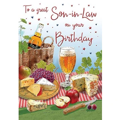 A High Quality Greeting Card and Envelope From Regal Publishing Designed and made in the UK - supporting British jobs Caption: Son in Law Description: ST Son in Law Beer and cheese Approximate size (inches): 9 x 6