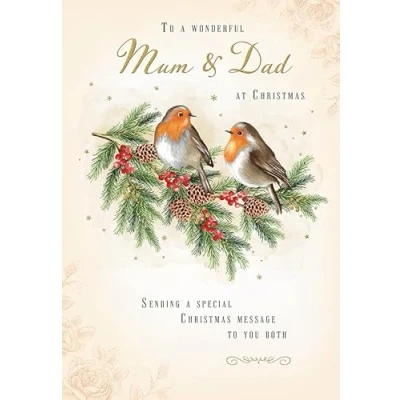 Piccadilly Greetings Christmas Card To a Wonderful Mum & Dad Cute 2 robins 9 x 6 inches