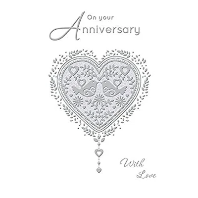 A High Quality Greeting Card and Envelope From Piccadilly Greetings Designed and made in the UK - supporting British jobs Caption: Anniv Your Description: Two Birds In Silver Heart Approximate size (inches): 8 x 6