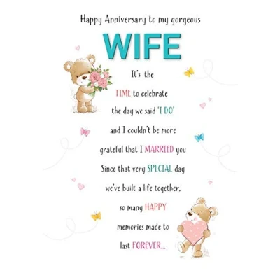 High quality greeting card and envelope Caption: Anniv Wife Description: HH Anniv Wife Bear and Flowers Approximate size (inches): 9 x 6 Designed and made in the UK