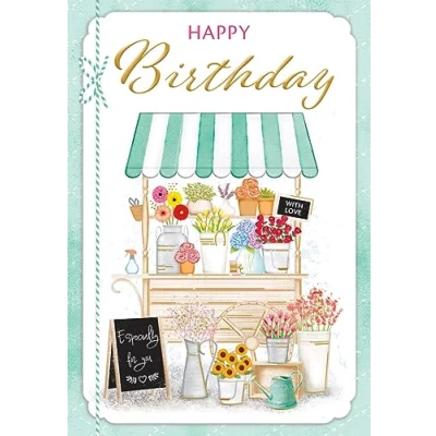 A High Quality Greeting Card and Envelope From Piccadilly Greetings Designed and made in the UK - supporting British jobs Caption: Birthday F Description: Flower Stand Approximate size: 7 x 5 inches