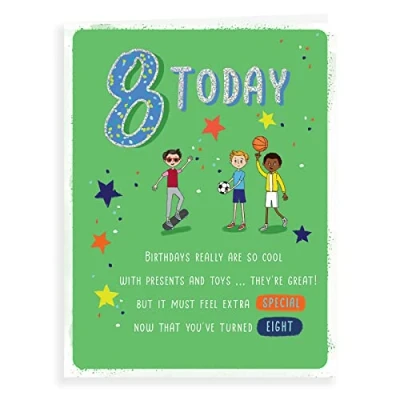 A High Quality Greeting Card and Envelope From Piccadilly Greetings Designed and made in the UK - supporting British jobs Caption: Age 8 M Description: Sports Approximate size: 8 x 6 inches