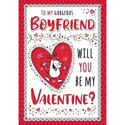 A High Quality, Hand Finished, Greeting Boxed Card From Regal Publishing Designed and made in the UK - supporting British jobs Caption: Boyfriend Description: VAL Boyfriend Dog in heart Approximate size: 10 x 7 inches