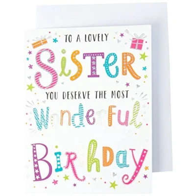 A High Quality Greeting Card and Envelope From Regal Publishing Designed and made in the UK - supporting British jobs Caption: Sister Description: Dazzles Sister Colourful text Approximate size: 8 x 6 inches