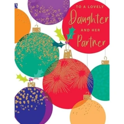 A High Quality Christmas Card and Envelope From Piccadilly Greetings Designed and made in the UK - supporting British jobs Caption: Daughter & Partner Description: Baubles Approximate size: 8 x 6 inches