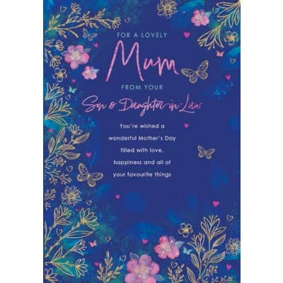 A High Quality Mother's Day Greeting Card and Envelope From Piccadilly Greetings Designed and made in the UK - supporting British jobs Caption: Mum From Son & DIL Description: Dark Flora Approximate size: 10 X 7 inches
