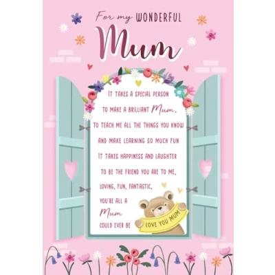 A High Quality Mother's Day Greeting Card and Envelope From Piccadilly Greetings Designed and made in the UK - supporting British jobs Caption: Mum Description: Bear Window Approximate size: 9 x 6 inches