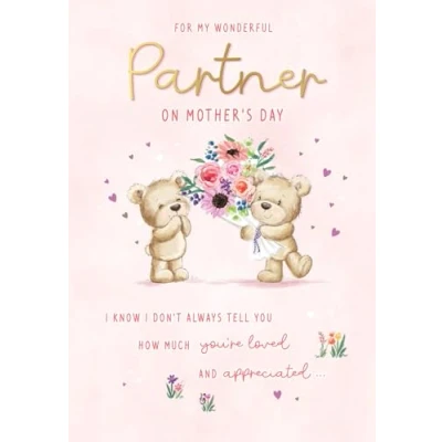 A High Quality Mother's Day Greeting Card and Envelope From Piccadilly Greetings Designed and made in the UK - supporting British jobs Caption: Partner Description: Bears & flowers Approximate size: 9 x 6 inches