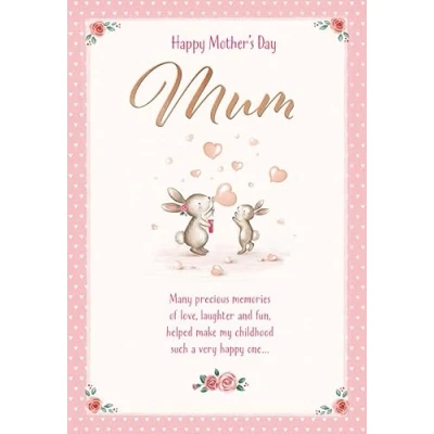 A High Quality Mother's Day Greeting Card and Envelope From Piccadilly Greetings Designed and made in the UK - supporting British jobs Caption: Mum Description: Mum & bunny Approximate size: 9 x 6 inches