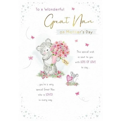 A High Quality Mother's Day Greeting Card and Envelope From Piccadilly Greetings Designed and made in the UK - supporting British jobs Caption: Great Nan Description: bear and mouse Approximate size: 9 X 6 inches
