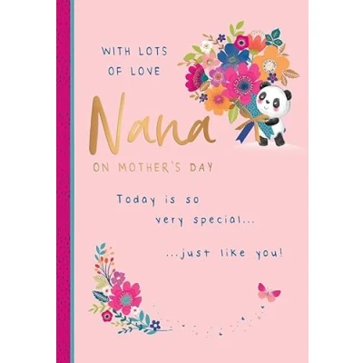 A High Quality Mother's Day Greeting Card and Envelope From Piccadilly Greetings Designed and made in the UK - supporting British jobs Caption: Nana Description: Panda & flowers Approximate size: 9 x 6 inches