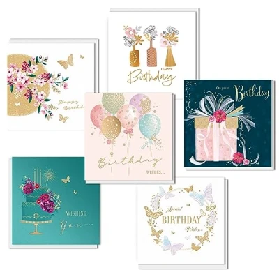 BIRTHDAY CARD MULTIPACK FEMALE – Pack contains 6 luxury, high quality cards, 16x16 cm in size, with 6 white envelopes. Message inside cards reads as per image, with plenty of space for your own handwritten greeting messages LUXURY CARDS – 6 six gorgeous, high quality, luxury designs, with two foil finish. Supplied with premium quality white diamond flap envelopes. MADE AND DESIGNED IN THE UK - these cards are desgined, manufactured and pack in the UK, supporting British Jobs! ECO FRIENDLY PRODUCTS - Our Cards are made from sustainable materials which are fully recyclable. Cards and envelope are FSC Mix approved (paper from responsible sources) CARDS FOR YEAR ROUND USE – Cards perfect for all your female friends and family. Suitable for all ages and all Birthday occasion!