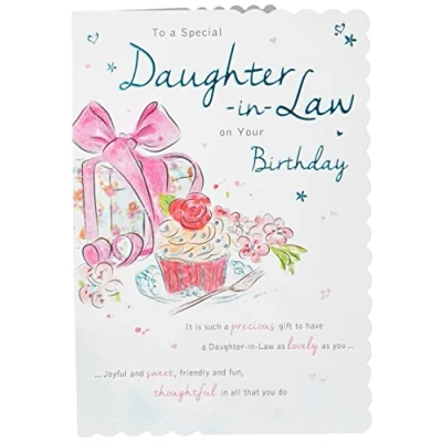 A High Quality Greeting Card and Envelope From Regal Publishing Designed and made in the UK - supporting British jobs Caption: Daughter In Law Description: LW Daughter In Law Gift and Cake Approximate size (inches): 9 x 6