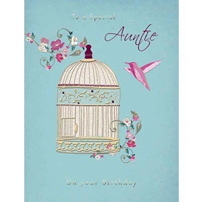 High quality greeting card and envelope Caption: Auntie Description: Bird and Cage Approximate size (inches): 8 x 6 Designed and made in the UK