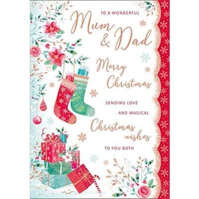 A High Quality Greeting Card and Envelope From Regal Publishing Designed and made in the UK - supporting British jobs Caption: Mum & Dad Description: 2 stockings Approximate size: 10 x 7 inches