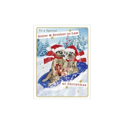 A High Quality Greeting Card and Envelope From Piccadilly Greetings Designed and made in the UK - supporting British jobs Caption: Sister & BIL Description: Meekats on sledge Approximate size: 8 x 6 inches
