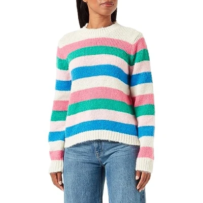 PIECES Women's Pcnatasha LS O Neck Knit Noos Bc Sweater, Birch/Stripes: Shocking Pink Mint rosh French Blue, M