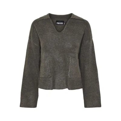 PIECES Women's Pcnuna LS V Neck Polo Knit bc Jumper, Morel/Detail: mélange, L