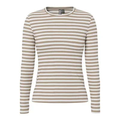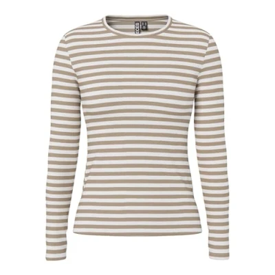 PIECES Women's Pcruka Ls Top Noos Bc T Shirt, Silver Mink/Stripes: Cloud Dancer, M