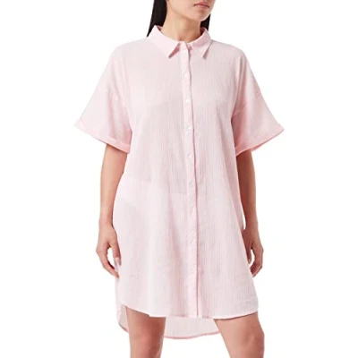 PIECES Women's Pcterra Ss Long Shirt Bc, Strawberry Pink/Stripes: Cloud Dancer, XS