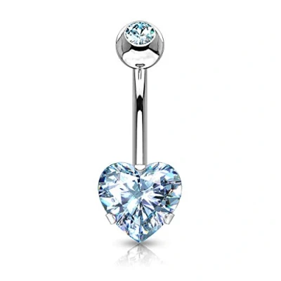 PiercedOff 316L Surgical Steel Belly Bar with Aqua CZ Heart Thickness 14GA (1.6mm) / Length 10mm Top Ball 5mm and Size is 7mm