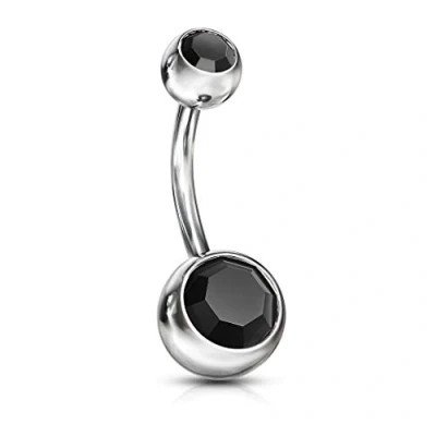 These belly bars are 1.6mm (14ga) thick and this is the standard thickness for most belly piercings The belly bar is 10mm long and is the standard length for belly piercings The top ball on this belly bar is 5mm in size, has a small cz gem in it and is externally threaded. The bottom ball is 8mm, also has a gem in it but does not unscrew This ensures that the bottom ball is always facing in the correct direction when worn. This is the standard size of of most belly bars The belly bars are manufactured from surgical stainless steel so will not rust, corrode or stain. This jewellery is best for healed piercings. Surgical Stainless Steel contains traces of nickel so may not be suitable for those with a nickel allergies. These belly bars are available in different lenghts and sizes ranging from 6mm to 14mm in length. They also have different size balls rannging from 4mm to 8mm in size. Please view our catalogue for the different options available