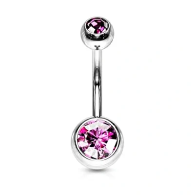 These belly bars are 1.6mm (14ga) thick and this is the standard thickness for most belly piercings The belly bar is 10mm long and is the standard length for belly piercings The top ball on this belly bar is 5mm in size, has a small cz gem in it and is externally threaded. The bottom ball is 8mm, also has a gem in it but does not unscrew This ensures that the bottom ball is always facing in the correct direction when worn. This is the standard size of of most belly bars The belly bars are manufactured from surgical stainless steel so will not rust, corrode or stain. This jewellery is best for healed piercings. Surgical Stainless Steel contains traces of nickel so may not be suitable for those with a nickel allergies. These belly bars are available in different lenghts and sizes ranging from 6mm to 14mm in length. They also have different size balls rannging from 4mm to 8mm in size. Please view our catalogue for the different options available