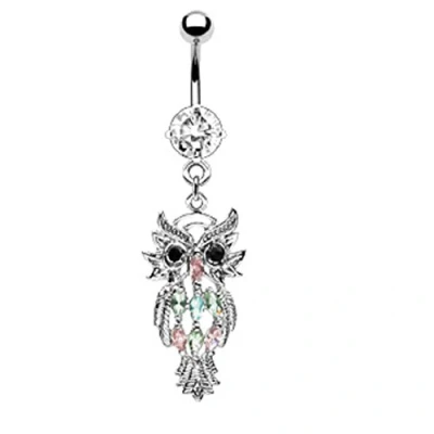 PiercedOff 316L Surgical Steel Externally Threaded Cz Gem Owl Dangle Belly Bar Thickness 14GA (1.6mm) / Length 10mm Ball Size 5mm 7mm 25 x 13