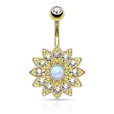 PiercedOff 316L Surgical Steel Gold Tone Belly Bar with Crystal Flower and White Synthetic Opal Center Thickness 14GA (1.6mm) Length 10mm / Top Ball is 5mm 18mm