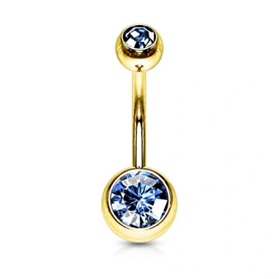 PiercedOff 316L Surgical Steel Gold Tone IP Belly Bar with Lite Blue CZ Balls Thickness 14GA (1.6mm) / Length 10mm Ball Sizes 5mm Top and 8mm Lower
