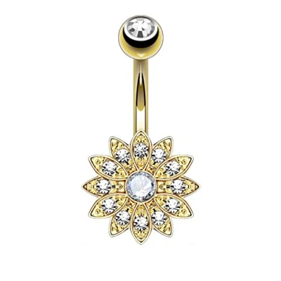 PiercedOff 316L Surgical Steel IP Gold Tone Externally Threaded Clear CZ Flower and Center Belly Bar Thickness 14GA (1.6mm) / Length 10mm Ball 5mm 13.5