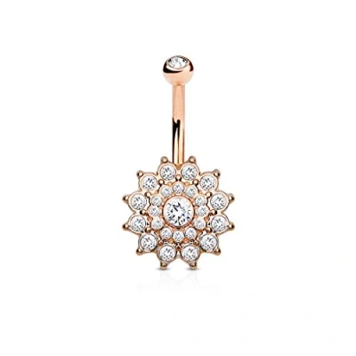 PiercedOff 316L Surgical Steel IP Rose Gold Tone Externally Threaded Belly Bar with Clear CZ Dahlia Flower Thickness 14GA (1.6mm) / Length 10mm Ball Size 5mm 16 x 16mm