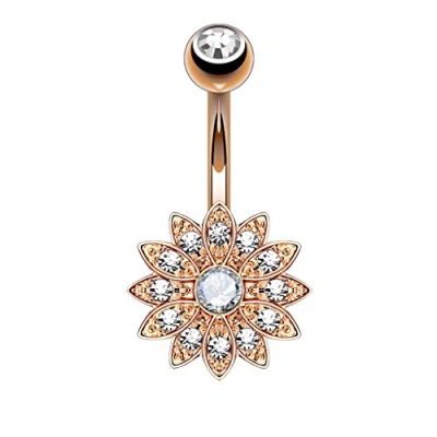 PiercedOff 316L Surgical Steel IP Rose Gold Tone Externally Threaded Clear CZ Flower and Center Belly Bar Thickness 14GA (1.6mm) / Length 10mm Ball 5mm 13.5