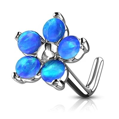 PiercedOff 316L Surgical Steel L Bend Nose Stud Flower with 5 Blue Synthetic Opal Petals Thickness 20GA (0.8mm) / Length 6mm Size
