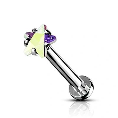 PiercedOff 316L Surgical Steel Labret with Aurora Borealis CZ Pronged Star Length 6mm Width 1.2mm
