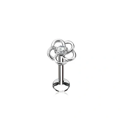PiercedOff 316L Surgical Steel Labret with Hollowed Flower and Clear CZ Gem Length 6mm Width 1.2mm