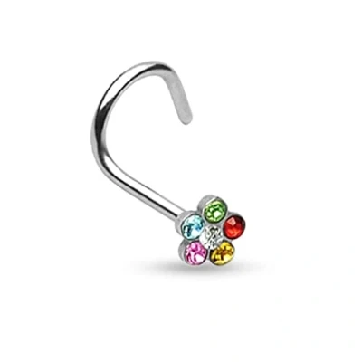 PiercedOff 316L Surgical Steel Nose Screw with Multiple Rainbow CZ Gems Flower Thickness 18GA (1mm) / Length 6mm Size 4mm