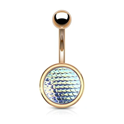 PiercedOff 316L Surgical Steel Rose Gold Tone Belly Bar with Holographic Aqua Dragon Scales Thickness 14GA (1.6mm) / Length 10mm Ball Size 5mm and 12mm for Lower Disc