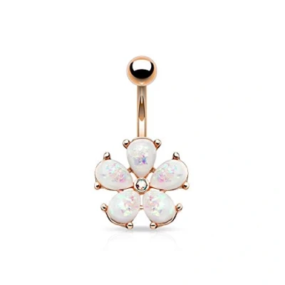 PiercedOff 316L Surgical Steel Rose Gold Tone Belly Bar with Synthetic White Opal Glitter Flower Thickness 14GA (1.6mm) Length 10mm / Top Ball 5mm 18mm