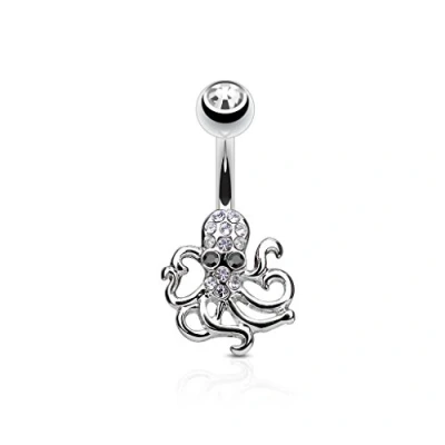 PiercedOff 316L Surigical Steel Belly Bar with Clear CZ Octopus Thickness 14GA (1.6mm) / Length 10mm Ball Size 5mm Octopuss 10 x 11mm