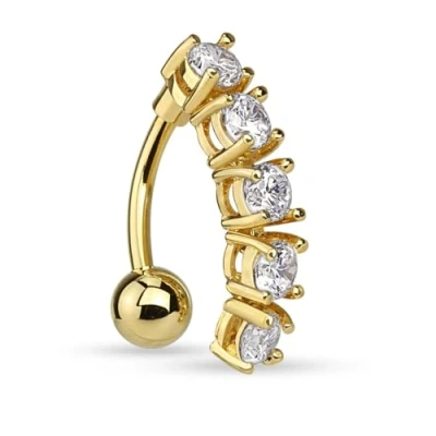 PiercedOff 316LSurgical Steel Gold Tone Top Down (Reverse) Belly Bar with 5 Clear CZ Dangle Thickness 14GA (1.6mm) / Length 10mm Ball Size 5mm and is 25mm x 4mm